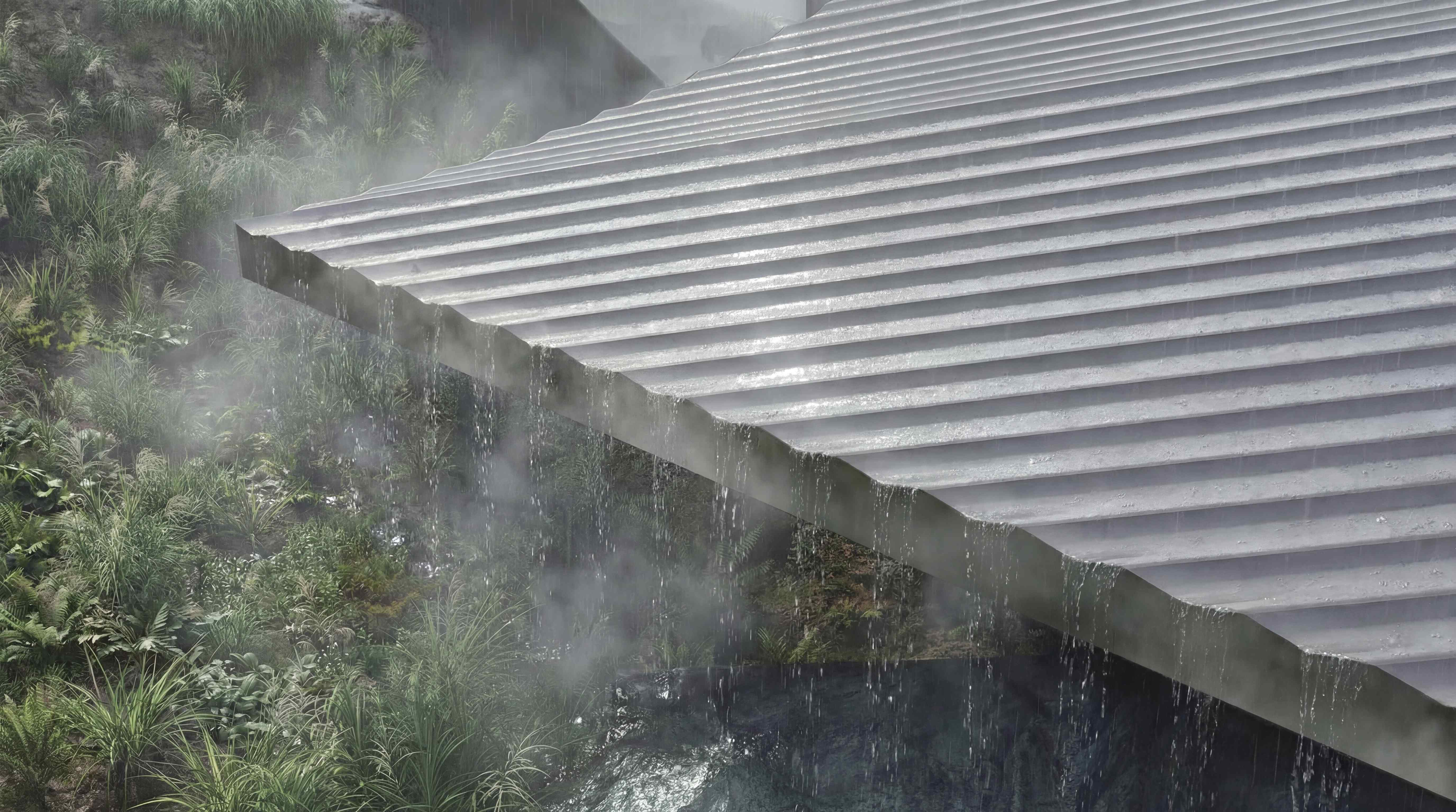 Yakushima is defined by its water. It is said that it rains thirty-five days a month—and to live here is to inhabit the rain itself. The design does not resist this. Three sloping roofs follow the rhythm of the surrounding peaks, channeling the island's rainfall along fluted tiles into shimmering curtains at the building's edge. What might be kept out becomes the boundary itself: a living, moving threshold between inside and wild.