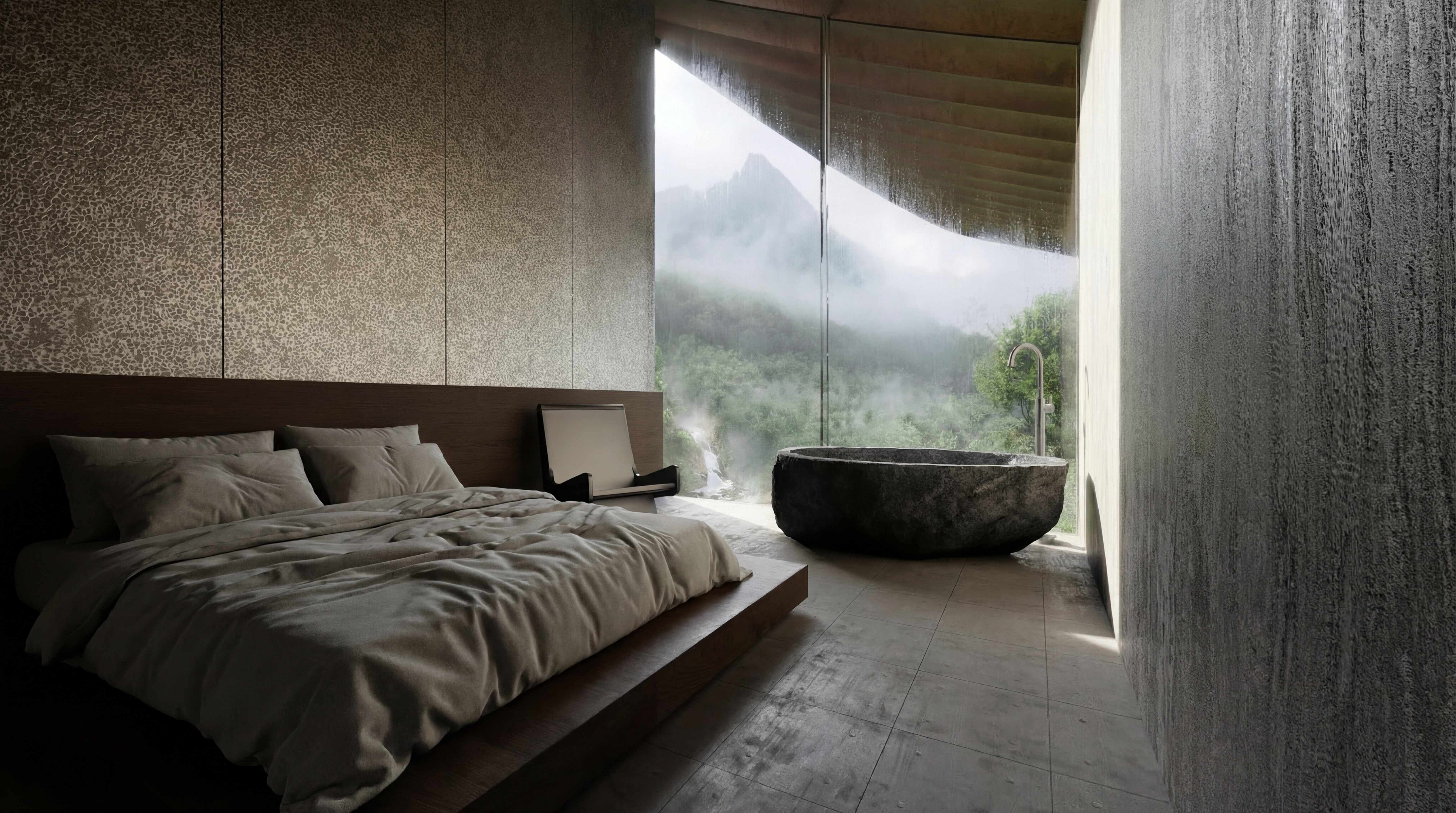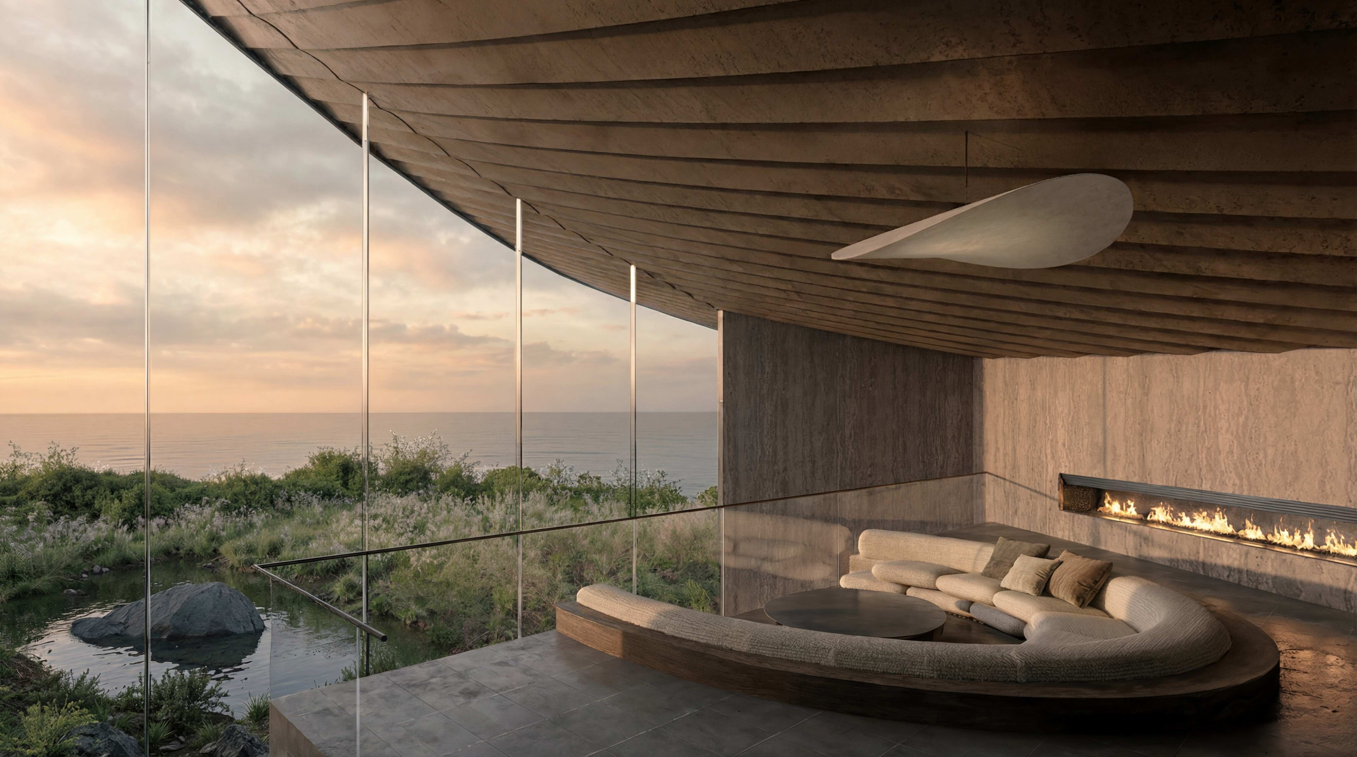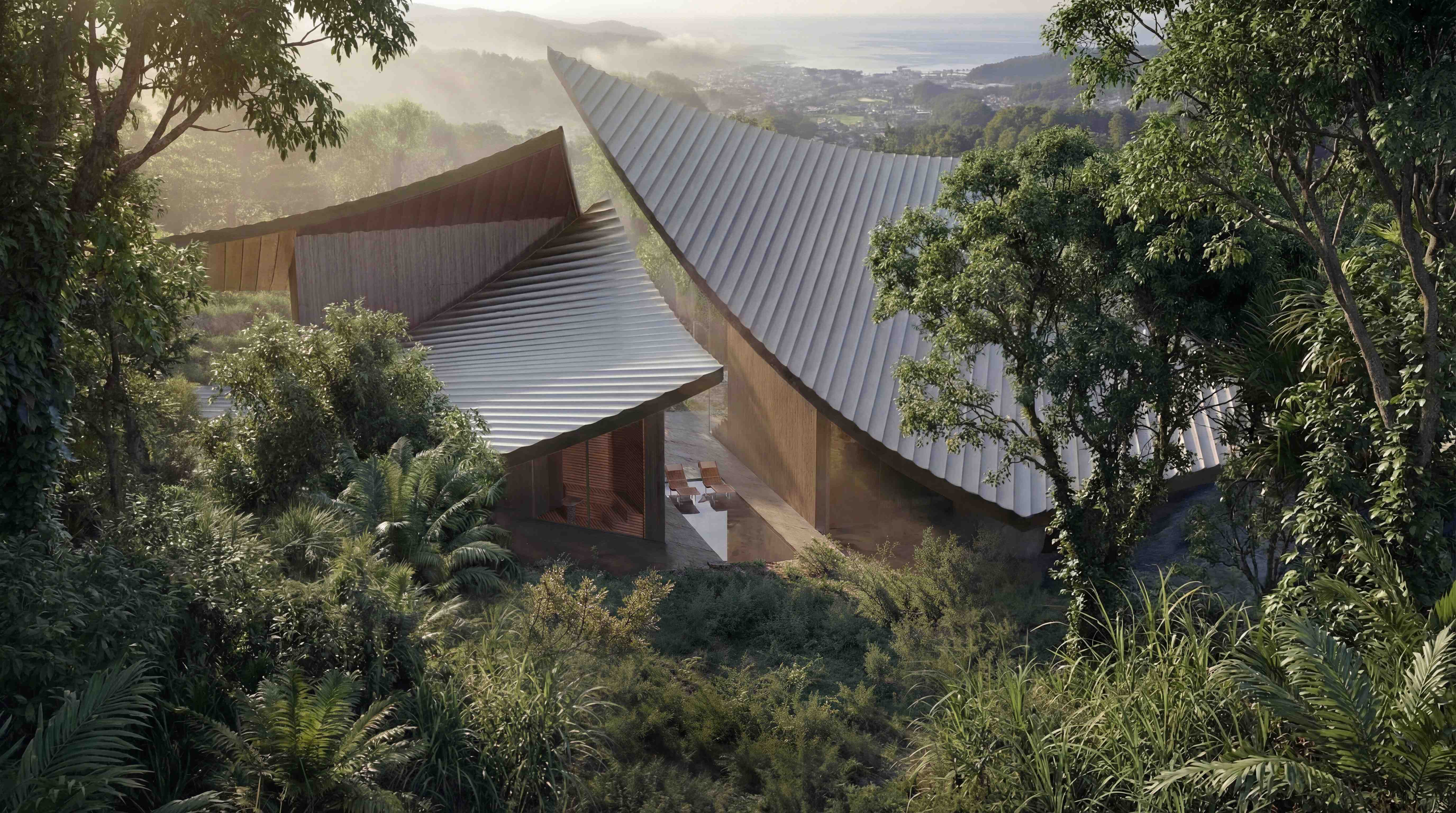 Four distinct sanctuaries lie beneath the intersecting rooflines: a mountain-facing fire terrace, a pool held within the forest, a dining room that dissolves into the trees through panoramic glazing, and a living room that frames the ocean through the sweep of the roofline. Bedrooms are isolated as private retreats, each opening directly onto the spine's terrace—ensuring that nature is not merely viewed, but physically traversed in daily life.