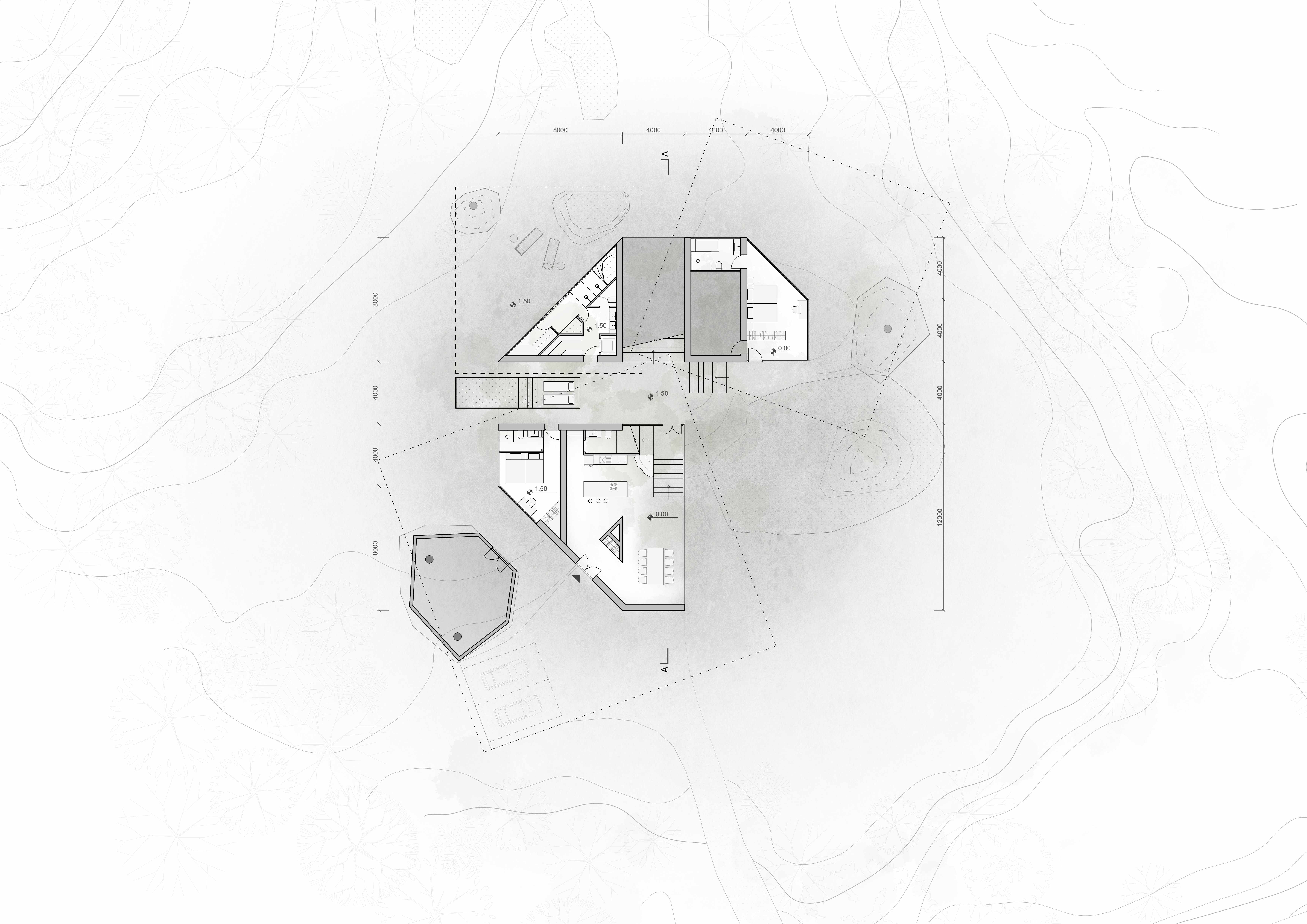 The building is organized around a central spine that rises gradually from the forest floor—from +0.0 to +1.5 to +3.0—turning the act of moving through the house into a sectional journey. The lower floor is submerged in the density of the surrounding forest, intimate and enclosed. The upper floor opens in two directions at once: toward the looming mountain peaks behind, and the expansive seascape ahead.
