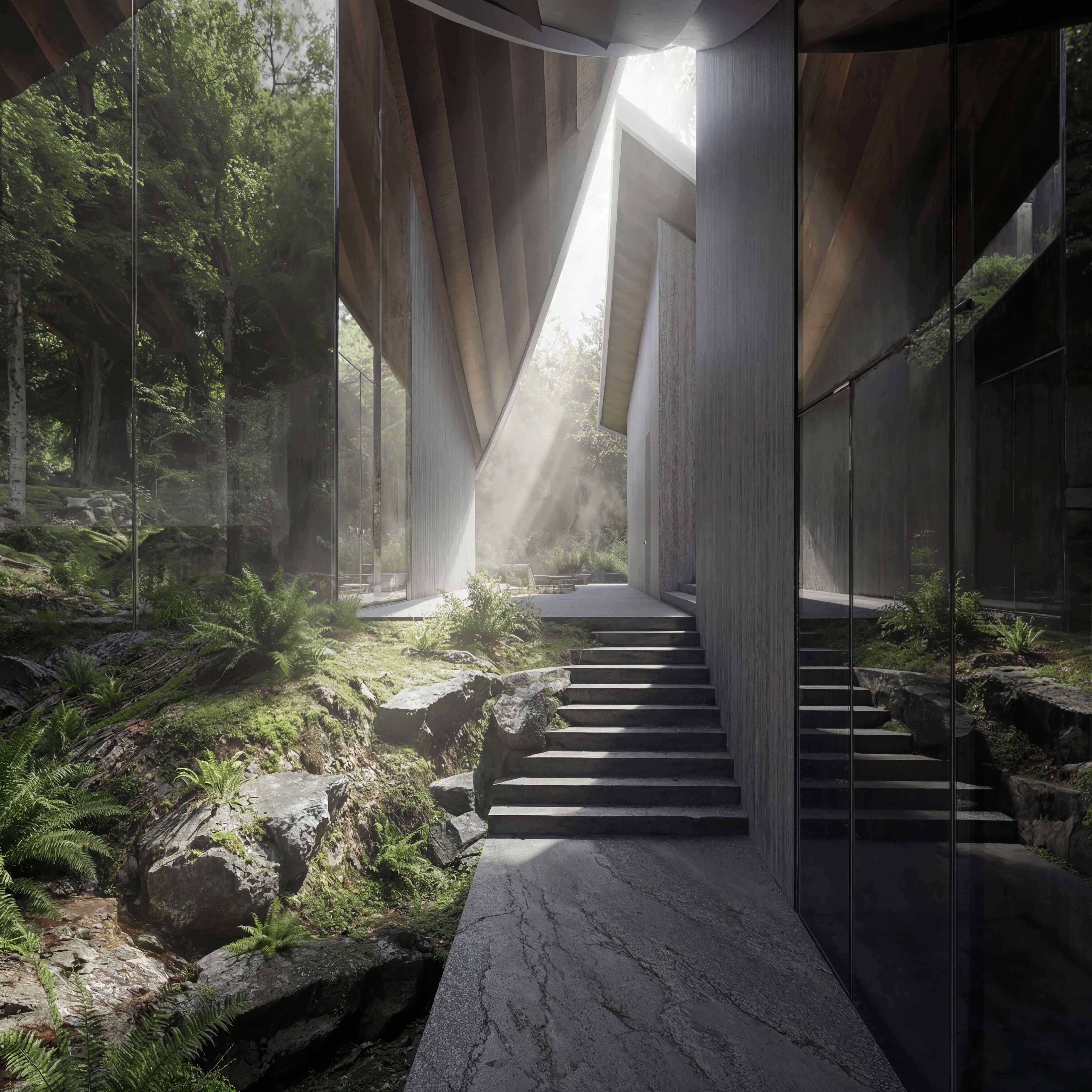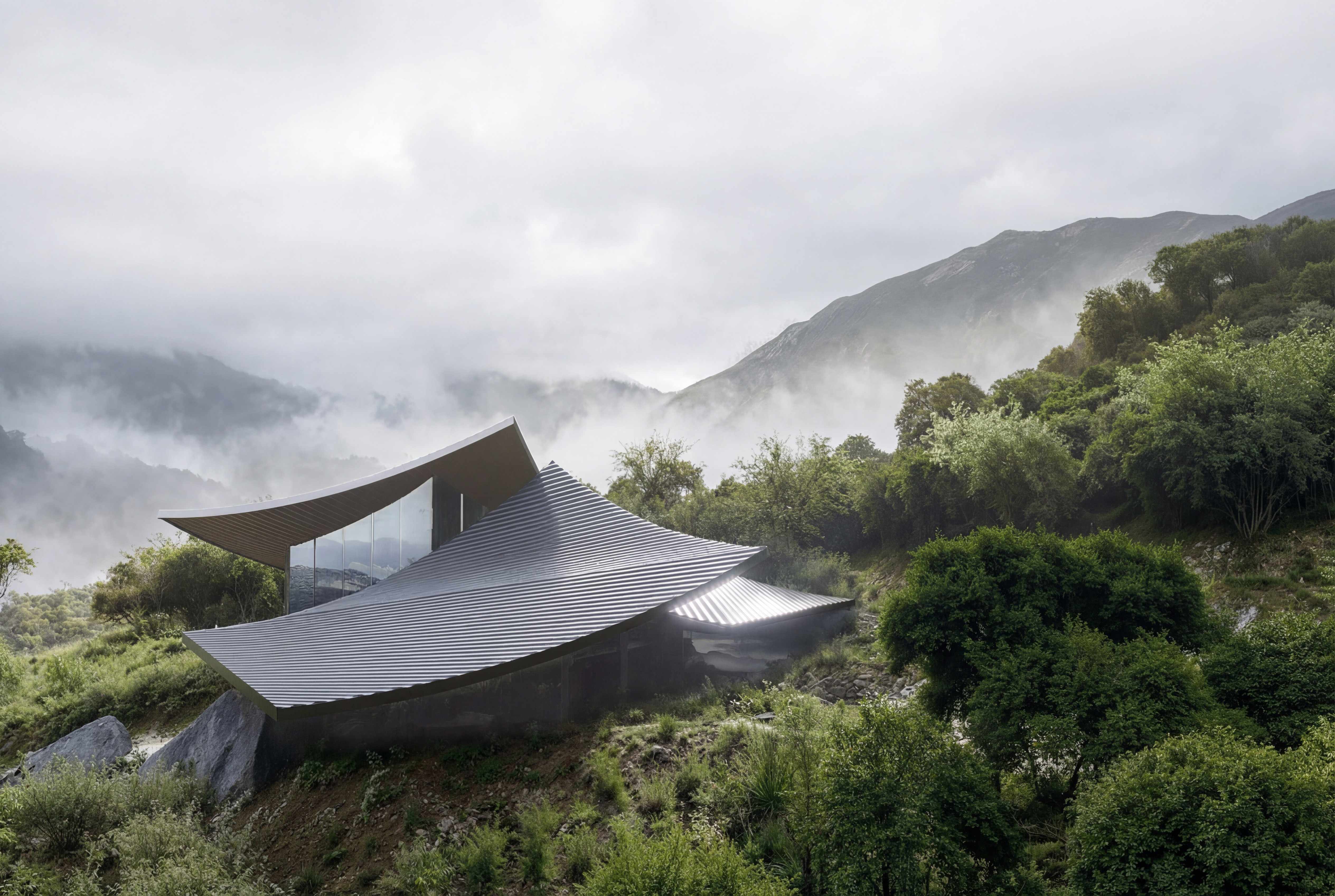 The massing deconstructs the mountain into three volumes anchored by monolithic stone bases. Emerging from the slope rather than sitting upon it, the structure reads as a tectonic extension of the landscape—as if the peaks had simply continued downward into shelter.