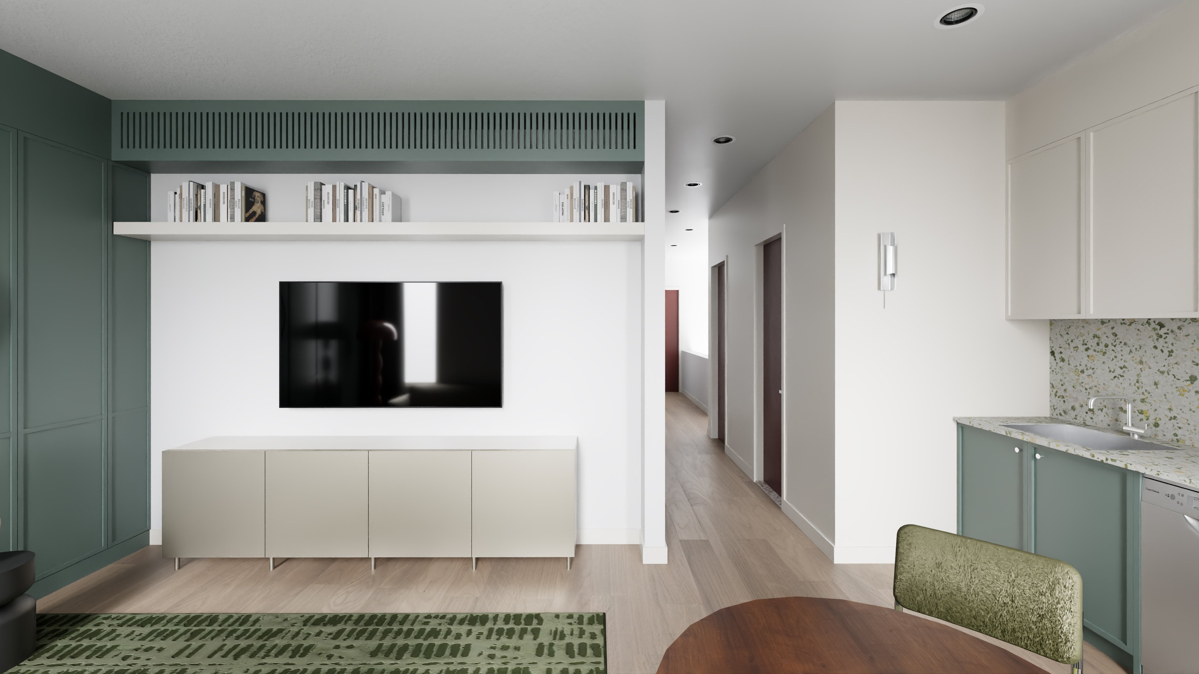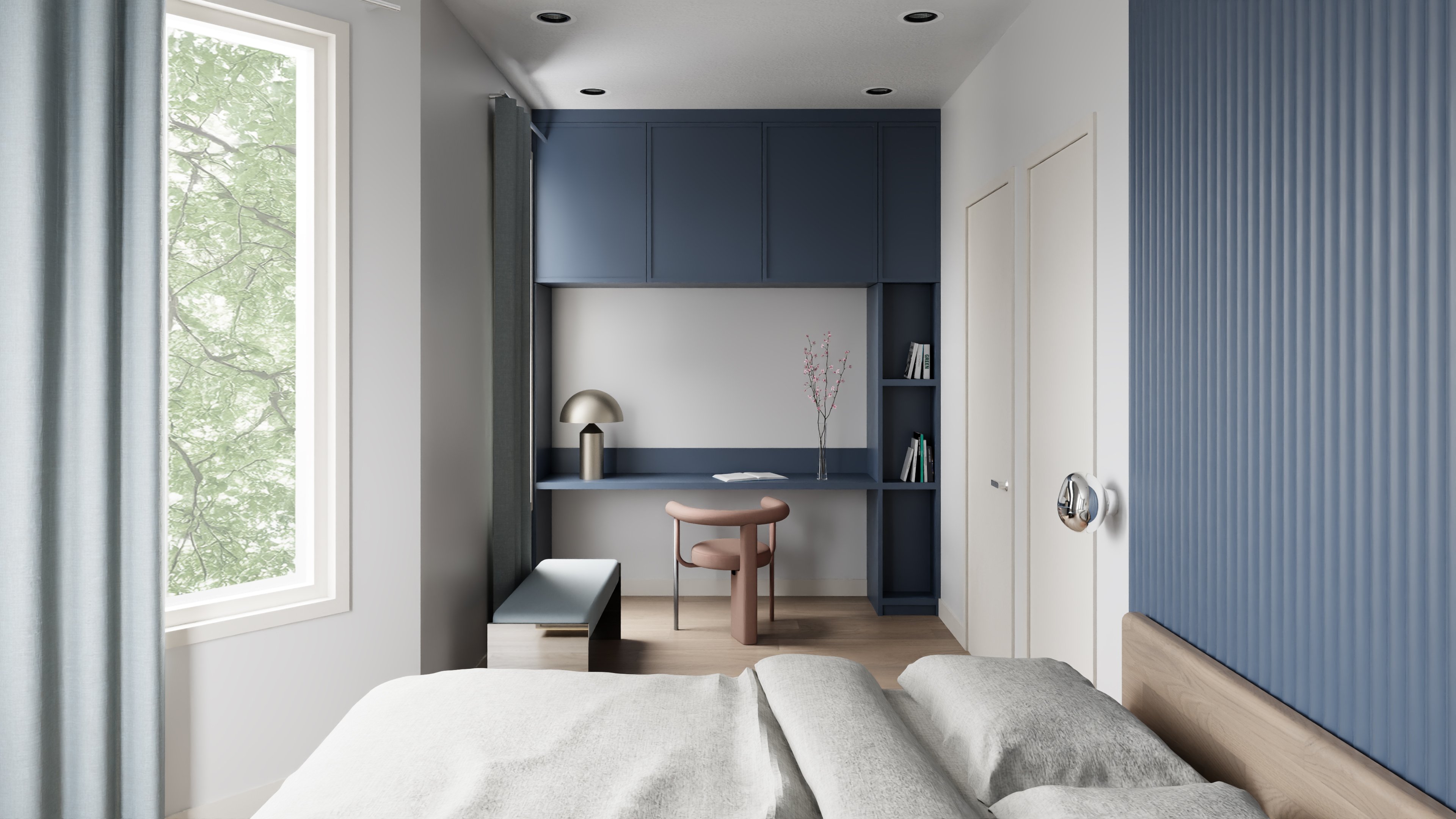 This dynamic energy bleeds into the central hallway, where all bedroom doors are painted in the same confident red. Paired with a curated collection of New York street photography, the corridor transcends its transitional purpose, becoming an immersive gallery space that visually guides guests toward the deep, calming blue of the primary bedroom. To tie this energetic journey together, delicate pink hues and warm copper accents are thoughtfully woven throughout the entire apartment, allowing guests to live and breathe the city's cohesive yet eclectic rhythm.