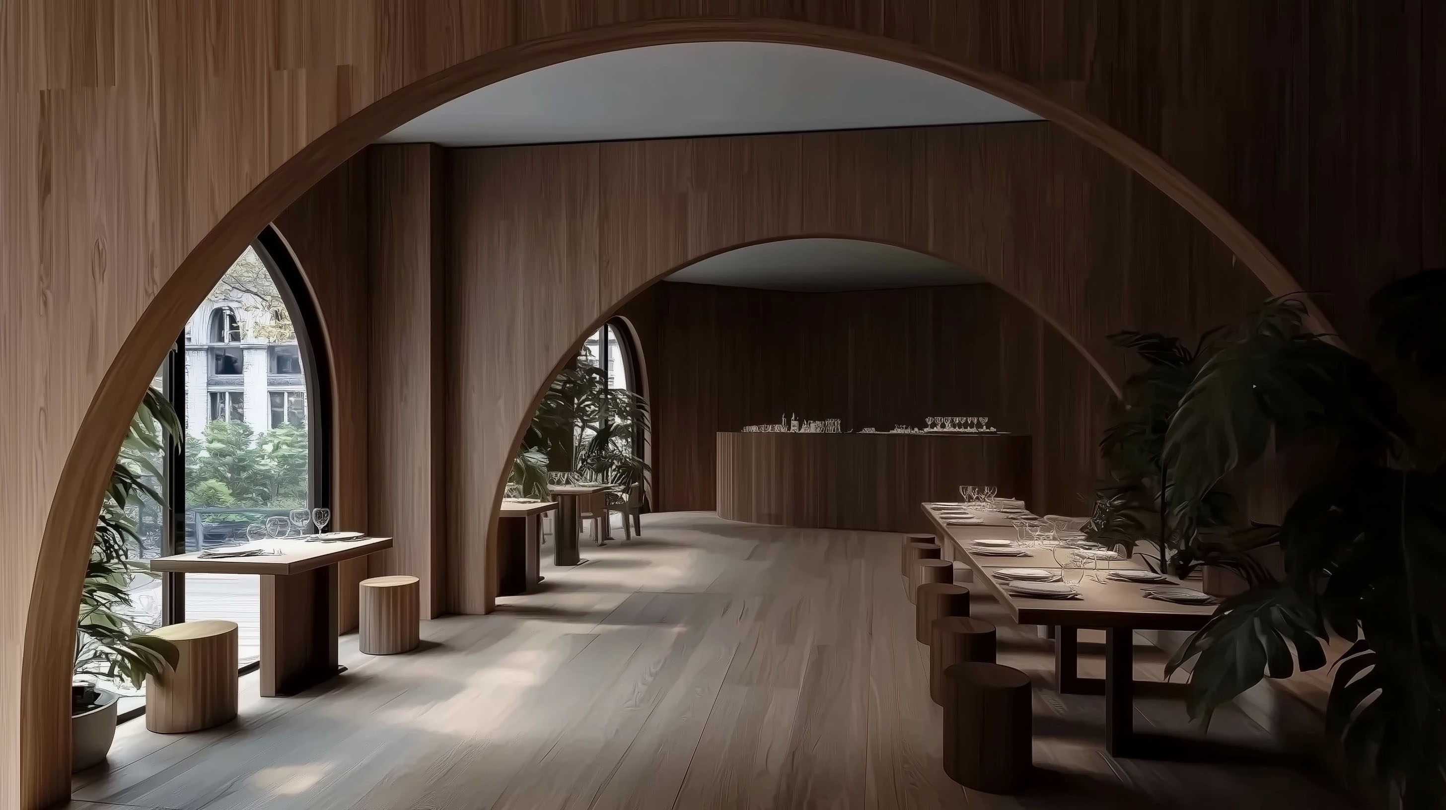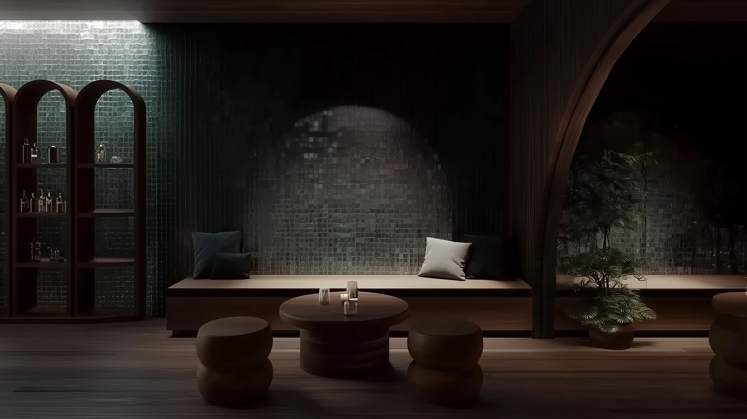A series of soft timber arches runs the length of the room, casting shadows that shift through the day. By morning, light falls clean through the curves and Willow & Stone opens as a coffee retreat—unhurried, quiet, grounded. By evening, the same room draws inward: candles, wine, and the green tilework take on a different depth. The design holds both without explaining either, letting the space change around the people who fill it.